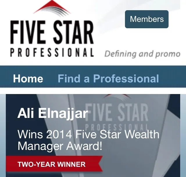 Five Star Professional named Ali Elnajjar "Five Star Wealth Manager" in 2013 and 2014. Wealth manager award candidates are identified through firm nominations, peer nominations and industry qualifications, and then evaluated on 10 objective eligibility and evaluation criteria including; client retention rates, client assets administered, firm review and a favorable regulatory and complaint history. This award is given to just 7% of all Wealth Managers in the Atlanta market area.